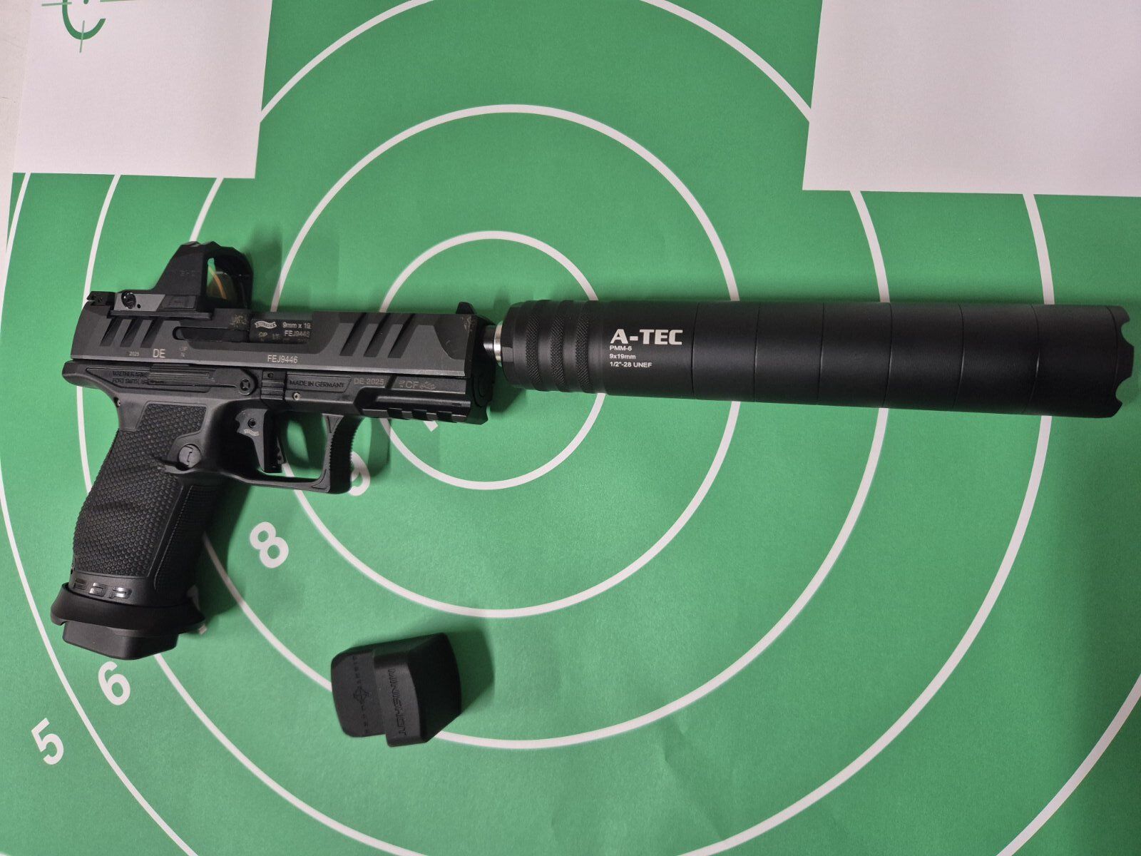 WALTHER PDP 4,6 C PRO SD, kolimatorius Sightmark Mini Shot M-Spec M1 V2 duslintuvas A-Tec PMM-6 ≤ 9 mm – 1/2″-28 UNEF |